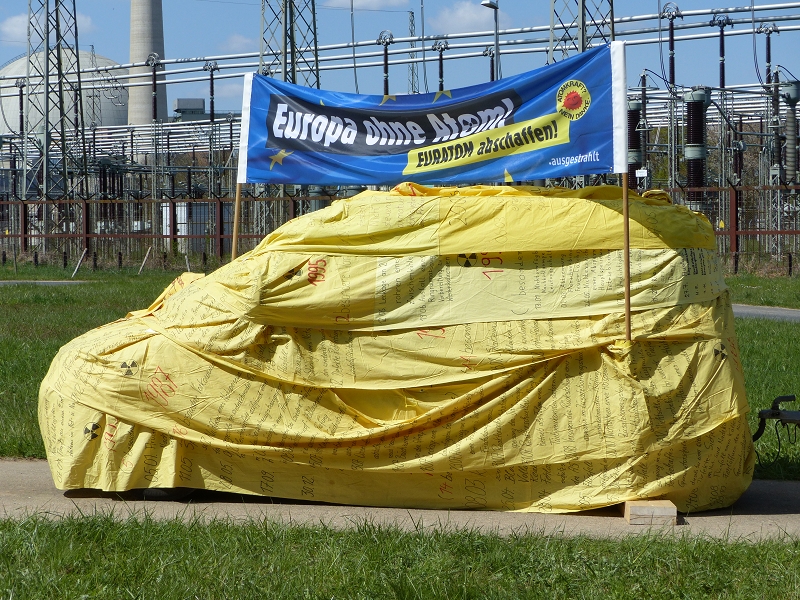 Die Verhüllung erfolgte mit unserer ca. 90 Meter langen Störfallschriftrolle des AKW Grafenrheinfeld, sie enthält die uns bekannten mehr als 240 Störfälle des AKW Grafenrheinfeld.
